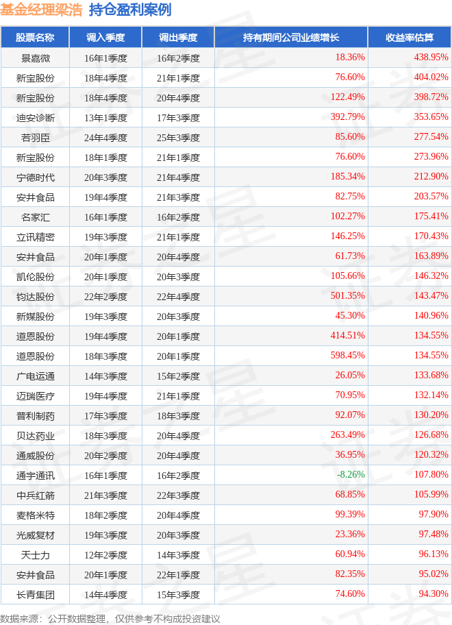 以下为梁浩所任职基金的部分重仓股调仓案例: