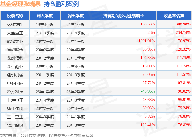 张晓泉管理的平安新鑫先锋A基金在19年4季度买入亿纬锂能,在持有1年又1个季度后在21年1季度卖出。持有期间的估算收益率为308.98%,持有期间亿纬锂能在2019年到2021年的年报营业总收入增幅达163.58%。