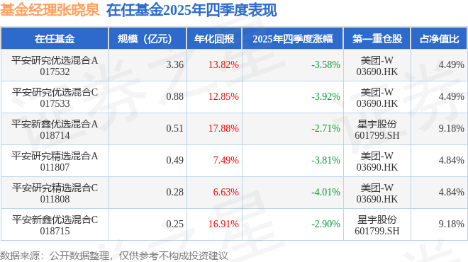 证券之星消息,截止2025年四季度末,基金经理张晓泉旗下共管理6只基金,本季度表现最佳的为平安新鑫优选混合A(018714),季度净值跌2.71%。