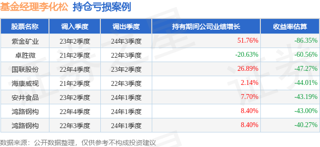 李化松管理的平安高端制造混合A基金在23年2季度买入紫金矿业,在持有1年又1个季度后在24年3季度卖出。持有期间的估算收益率为-86.35%,持有期间紫金矿业在2023年到2024年的年报归属净利润增幅达51.76%。