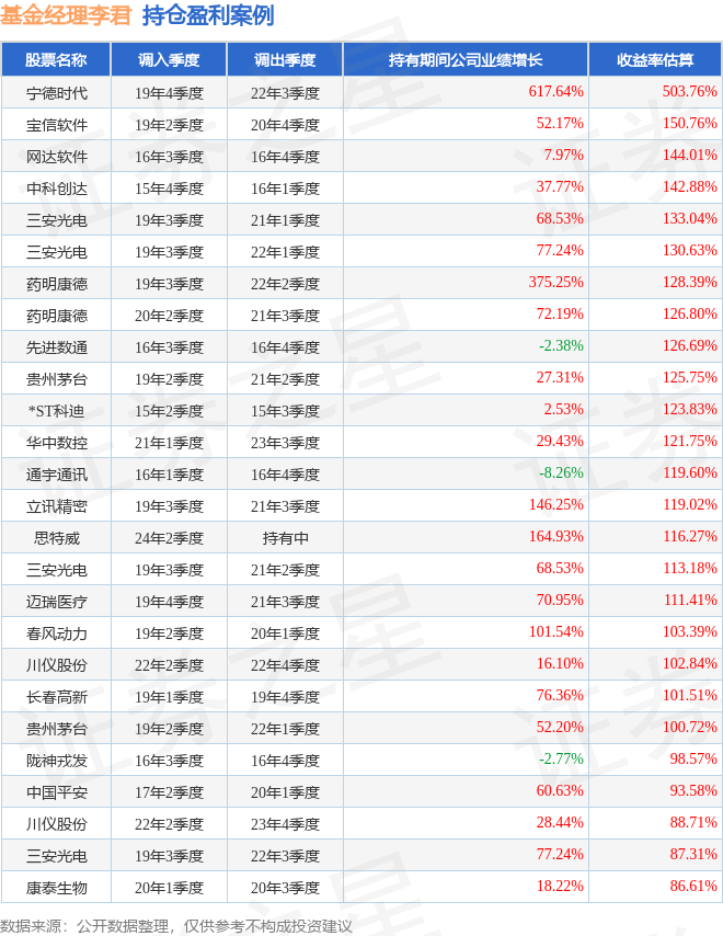李君管理的鹏华创新动力LOF基金在19年4季度买入宁德时代,在持有2年又3个季度后在22年3季度卖出。持有期间的估算收益率为503.76%,持有期间宁德时代在2019年到2022年的年报营业总收入增幅达617.64%。