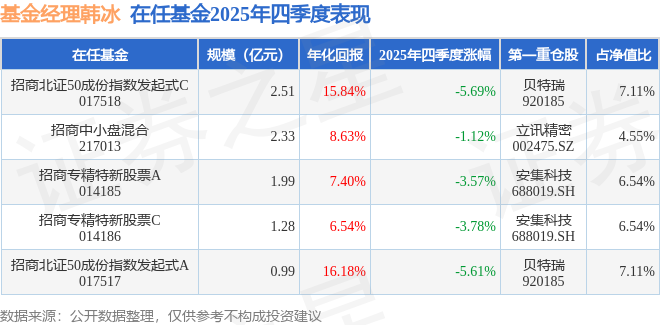 证券之星消息,截止2025年四季度末,基金经理韩冰旗下共管理5只基金,本季度表现最佳的为招商中小盘混合(217013),季度净值跌1.12%。