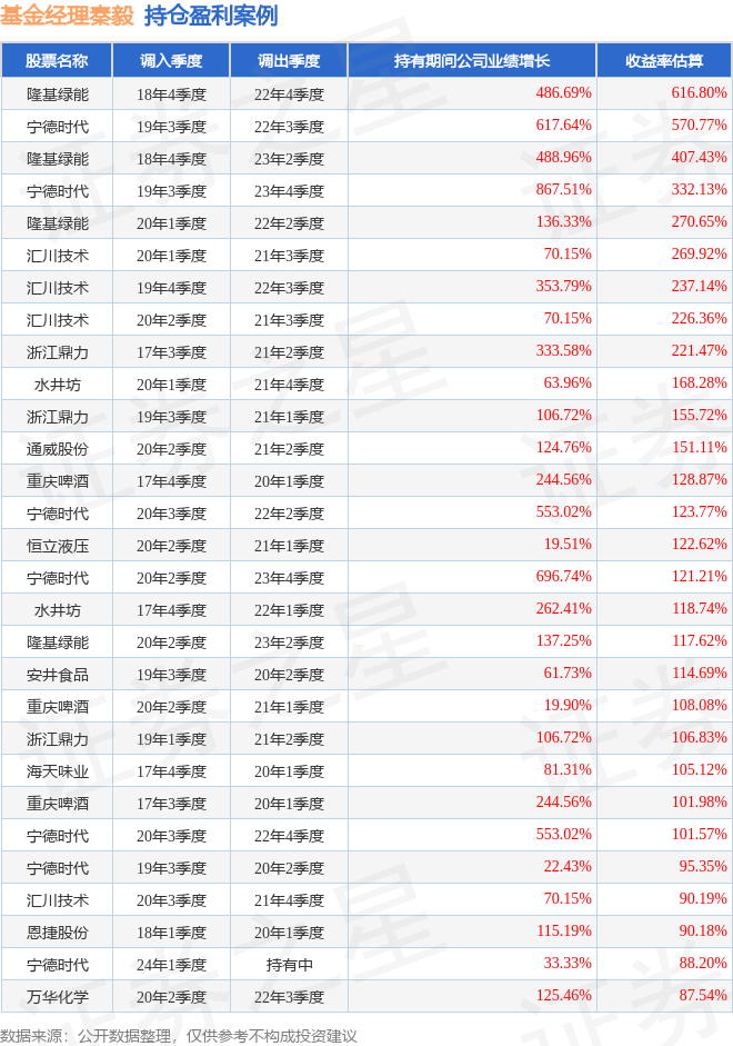 秦毅管理的泓德泓业混合基金在18年4季度买入隆基绿能,在持有4年又0个季度后在22年4季度卖出。持有期间的估算收益率为616.8%,持有期间隆基绿能在2018年到2022年的年报营业总收入增幅达486.69%。
