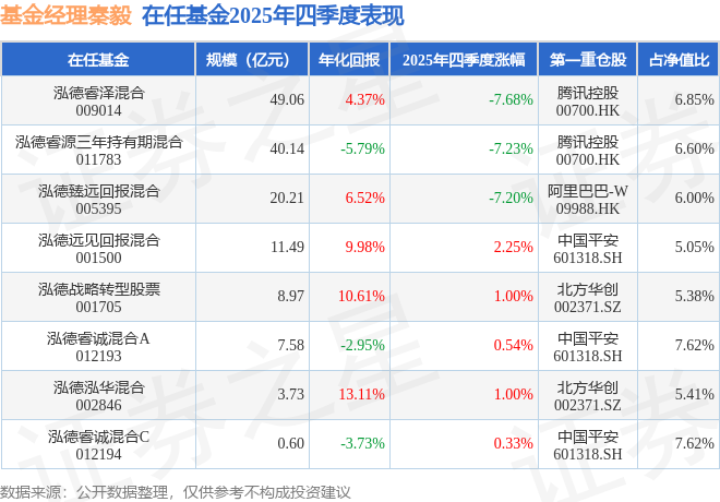 证券之星消息,截止2025年四季度末,基金经理秦毅旗下共管理8只基金,本季度表现最佳的为泓德远见回报混合(001500),季度净值涨2.25%。
