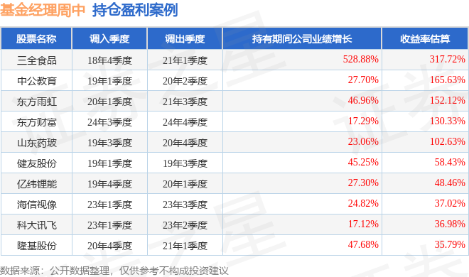 周中管理的交银创新成长混合基金在19年1季度买入健友股份,在持有2个季度后在19年3季度卖出。持有期间的估算收益率为58.43%,持有期间健友股份在2018年到2019年的年报营业总收入增幅达45.25%。