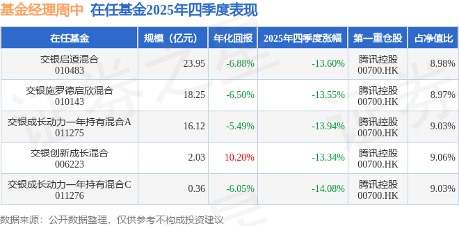 证券之星消息,截止2025年四季度末,基金经理周中旗下共管理5只基金,本季度表现最佳的为交银创新成长混合(006223),季度净值跌13.34%。