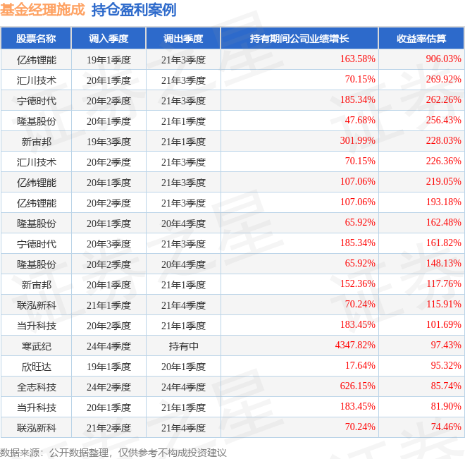 施成管理的国投瑞银先进制造混合基金在19年1季度买入亿纬锂能,在持有2年又2个季度后在21年3季度卖出。持有期间的估算收益率为906.03%,持有期间亿纬锂能在2019年到2021年的年报营业总收入增幅达163.58%。