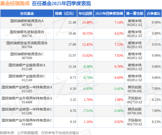 证券之星消息,截止2025年四季度末,基金经理施成旗下共管理10只基金,本季度表现最佳的为国投瑞银进宝灵活配置混合(001704),季度净值涨7.53%。