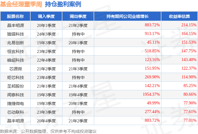董季周管理的泰信中小盘精选混合基金在20年1季度买入晶丰明源,在持有1年又1个季度后在21年2季度卖出。持有期间的估算收益率为214.15%,持有期间晶丰明源在2020年到2021年的年报归属净利润增幅达883.72%。