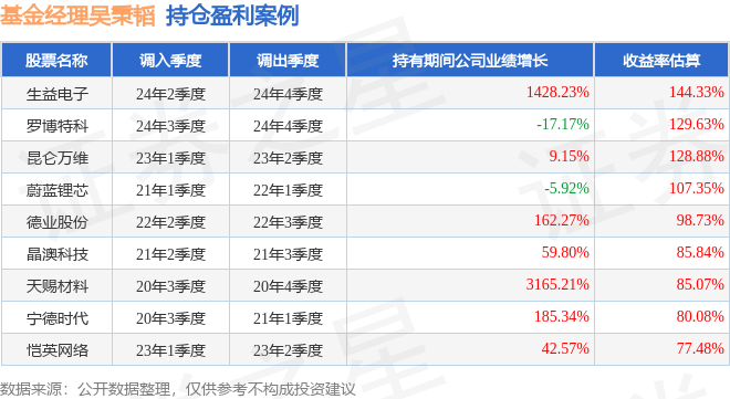 吴秉韬管理的泰信低碳经济混合发起式A基金在24年2季度买入生益电子,在持有2个季度后在24年4季度卖出。持有期间的估算收益率为144.33%,持有期间生益电子在2023年到2024年的年报归属净利润增幅达1428.23%。