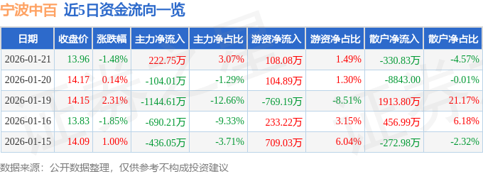 证券之星消息,截至2026年1月21日收盘,宁波中百(600857)报收于13.96元,下跌1.48%,换手率2.31%,成交量5.19万手,成交额7245.63万元。