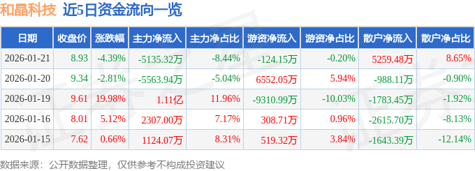 证券之星消息,截至2026年1月21日收盘,和晶科技(300279)报收于8.93元,下跌4.39%,换手率13.93%,成交量67.85万手,成交额6.08亿元。