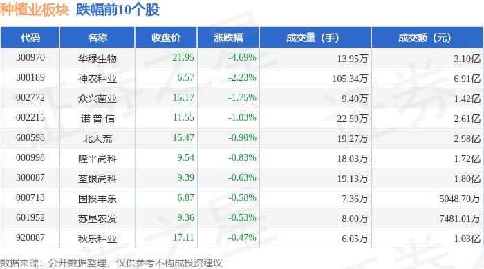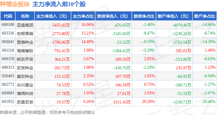 从资金流向上来看,当日种植业板块主力资金净流出7959.94万元,游资资金净流入7735.29万元,散户资金净流入224.64万元。种植业板块个股资金流向见下表: