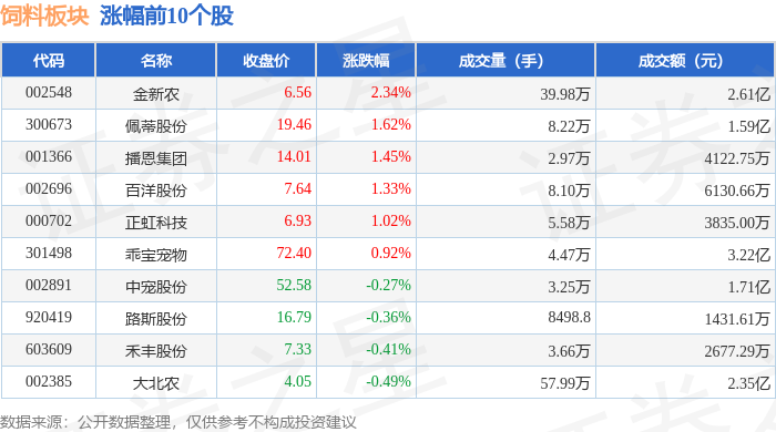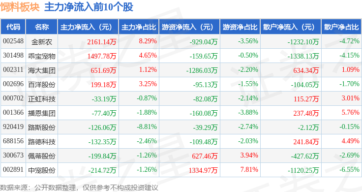 从资金流向上来看,当日饲料板块主力资金净流出9594.33万元,游资资金净流入3263.52万元,散户资金净流入6330.81万元。饲料板块个股资金流向见下表: