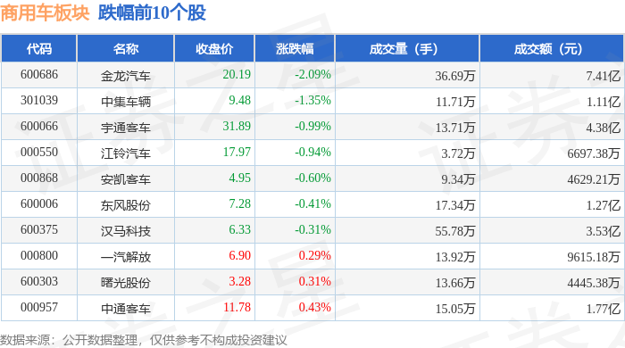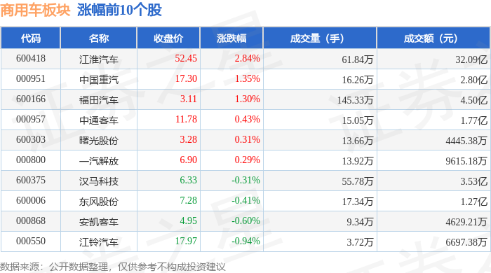 从资金流向上来看,当日商用车板块主力资金净流入4.17亿元,游资资金净流出1.68亿元,散户资金净流出2.49亿元。商用车板块个股资金流向见下表: