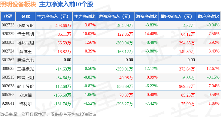 从资金流向上来看,当日照明设备板块主力资金净流出2549.91万元,游资资金净流出1029.3万元,散户资金净流入3579.21万元。照明设备板块个股资金流向见下表:
