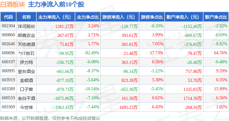 从资金流向上来看,当日白酒板块主力资金净流出26.42亿元,游资资金净流入17.83亿元,散户资金净流入8.58亿元。白酒板块个股资金流向见下表: