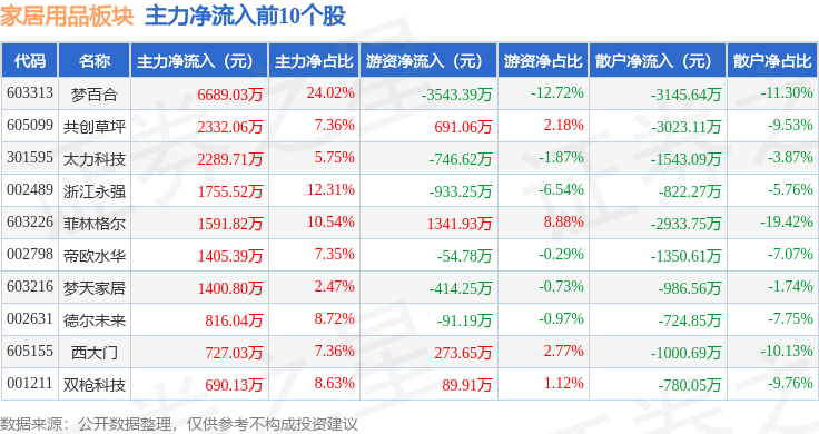 从资金流向上来看,当日家居用品板块主力资金净流入4979.61万元,游资资金净流出5645.74万元,散户资金净流入666.12万元。家居用品板块个股资金流向见下表: