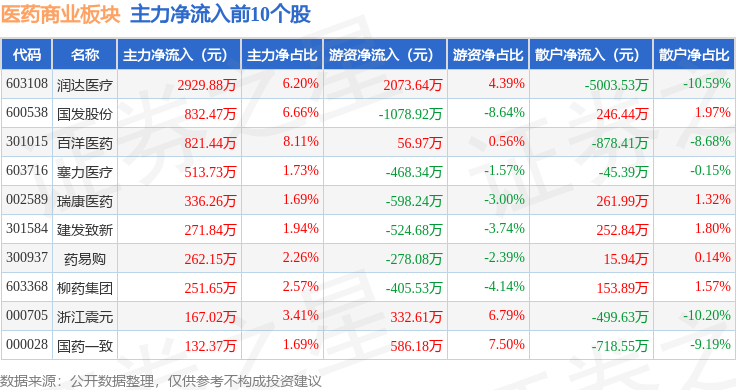 从资金流向上来看,当日医药商业板块主力资金净流出2.54亿元,游资资金净流出5951.38万元,散户资金净流入3.13亿元。医药商业板块个股资金流向见下表: