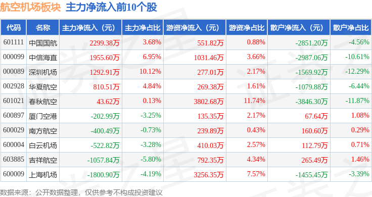 从资金流向上来看,当日航空机场板块主力资金净流出8483.06万元,游资资金净流入1.94亿元,散户资金净流出1.09亿元。航空机场板块个股资金流向见下表:
