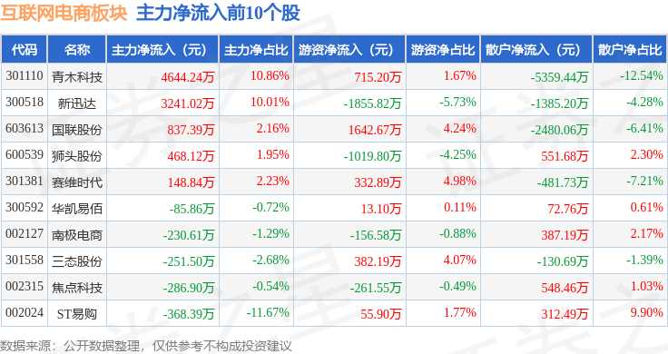 从资金流向上来看,当日互联网电商板块主力资金净流出2.19亿元,游资资金净流出2985.3万元,散户资金净流入2.48亿元。互联网电商板块个股资金流向见下表: