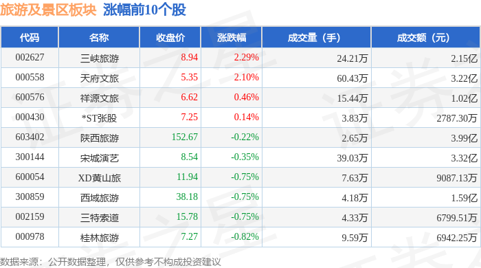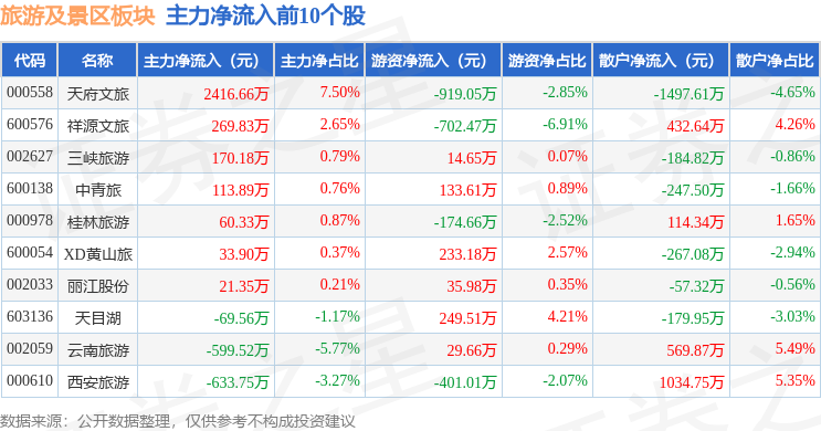 从资金流向上来看,当日旅游及景区板块主力资金净流出2.87亿元,游资资金净流入497.73万元,散户资金净流入2.82亿元。旅游及景区板块个股资金流向见下表: