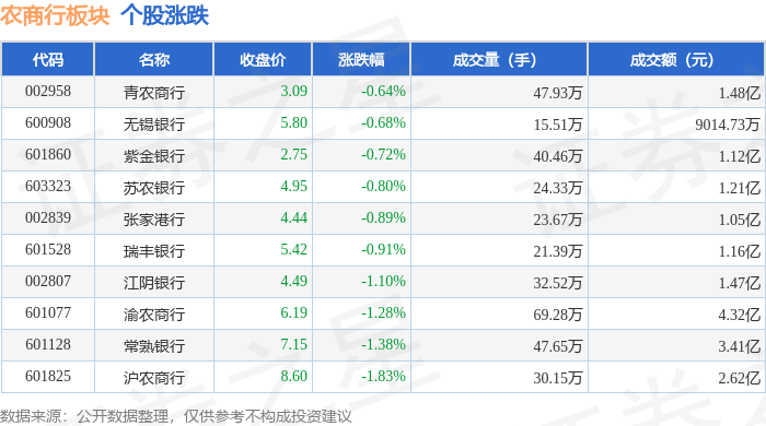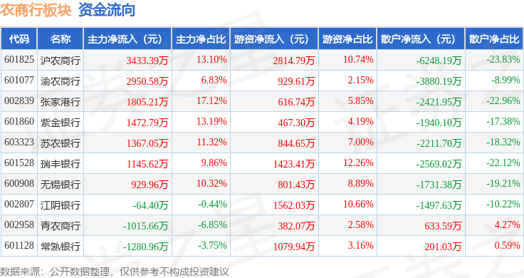从资金流向上来看,当日农商行板块主力资金净流入1.07亿元,游资资金净流入1.09亿元,散户资金净流出2.17亿元。农商行板块个股资金流向见下表:
