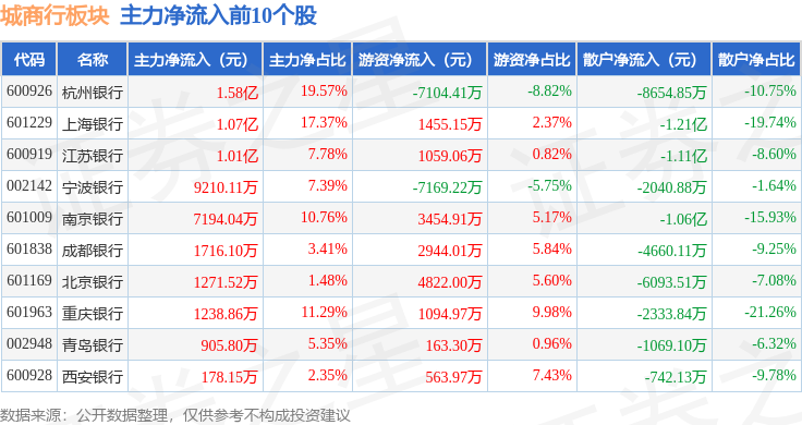 从资金流向上来看,当日城商行板块主力资金净流入5.08亿元,游资资金净流入5863.23万元,散户资金净流出5.66亿元。城商行板块个股资金流向见下表: