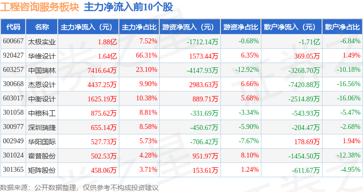 从资金流向上来看,当日工程咨询服务板块主力资金净流入1.79亿元,游资资金净流出1023.59万元,散户资金净流出1.69亿元。工程咨询服务板块个股资金流向见下表:
