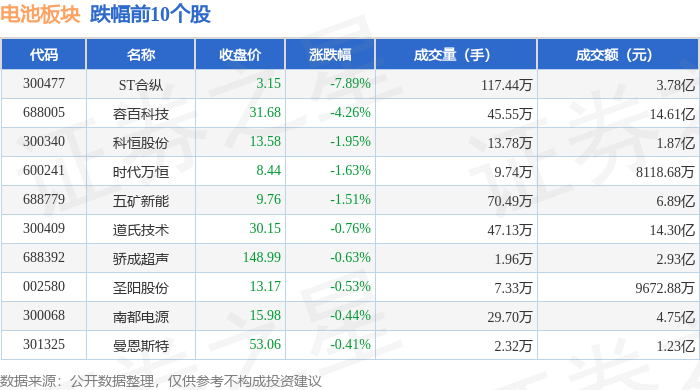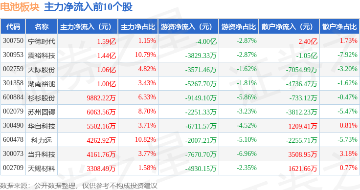 从资金流向上来看,当日电池板块主力资金净流出3.42亿元,游资资金净流出14.03亿元,散户资金净流入17.45亿元。电池板块个股资金流向见下表: