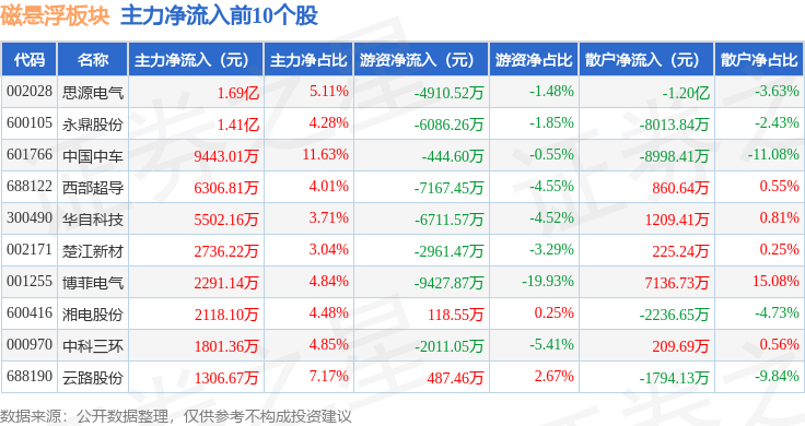 从资金流向上来看,当日磁悬浮板块主力资金净流入4606.96万元,游资资金净流出5.57亿元,散户资金净流入5.11亿元。磁悬浮板块个股资金流向见下表: