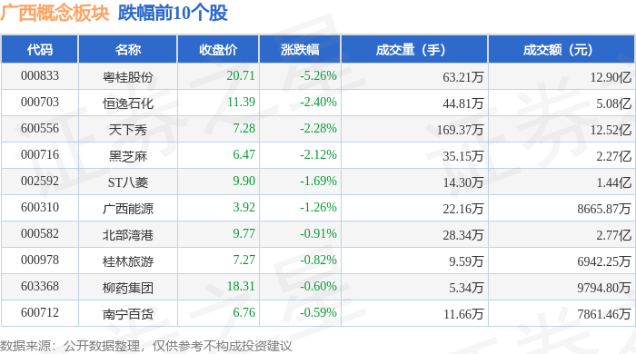 从资金流向上来看,当日广西概念板块主力资金净流出2.1亿元,游资资金净流入2350.65万元,散户资金净流入1.86亿元。广西概念板块个股资金流向见下表: