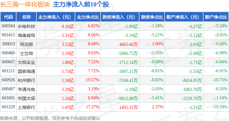 从资金流向上来看,当日长三角一体化板块主力资金净流入13.21亿元,游资资金净流入6936.28万元,散户资金净流出13.9亿元。长三角一体化板块个股资金流向见下表: