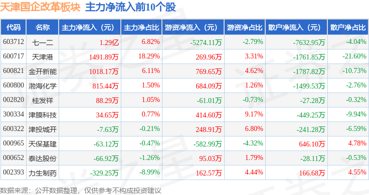 从资金流向上来看,当日天津国企改革板块主力资金净流入6814.79万元,游资资金净流出2477.85万元,散户资金净流出4336.94万元。天津国企改革板块个股资金流向见下表: