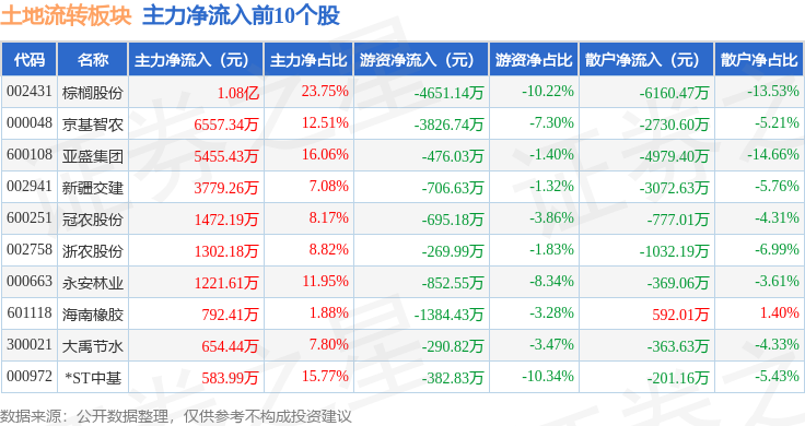 从资金流向上来看,当日土地流转板块主力资金净流出2.52亿元,游资资金净流入1.47亿元,散户资金净流入1.05亿元。土地流转板块个股资金流向见下表:
