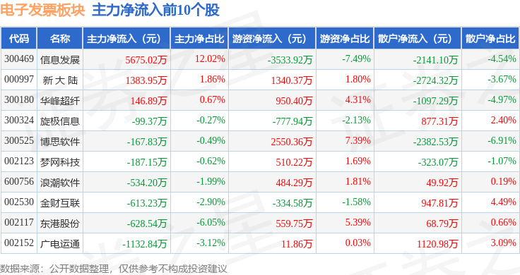 从资金流向上来看,当日电子发票板块主力资金净流出3.07亿元,游资资金净流入3824.7万元,散户资金净流入2.68亿元。电子发票板块个股资金流向见下表:
