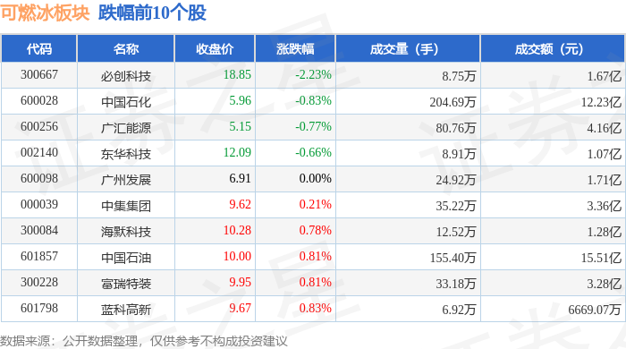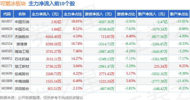 从资金流向上来看,当日可燃冰板块主力资金净流入5.78亿元,游资资金净流出1.48亿元,散户资金净流出4.3亿元。可燃冰板块个股资金流向见下表: