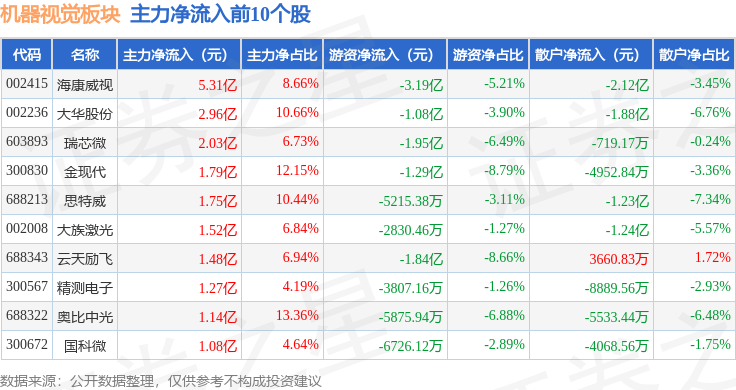 从资金流向上来看,当日机器视觉板块主力资金净流入18.34亿元,游资资金净流出15.52亿元,散户资金净流出2.82亿元。机器视觉板块个股资金流向见下表: