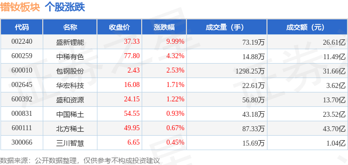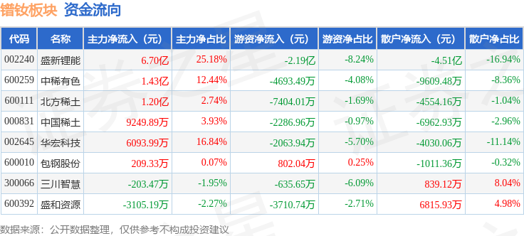 从资金流向上来看,当日镨钕板块主力资金净流入10.55亿元,游资资金净流出4.19亿元,散户资金净流出6.36亿元。镨钕板块个股资金流向见下表: