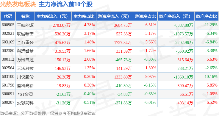 从资金流向上来看,当日光热发电板块主力资金净流出3.86亿元,游资资金净流入5926.04万元,散户资金净流入3.27亿元。光热发电板块个股资金流向见下表: