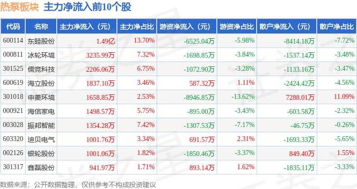 从资金流向上来看,当日热泵板块主力资金净流出1.56亿元,游资资金净流出2.99亿元,散户资金净流入4.55亿元。热泵板块个股资金流向见下表: