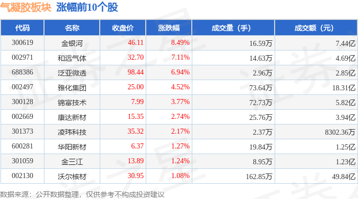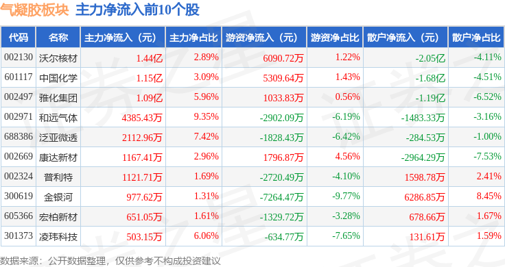 从资金流向上来看,当日气凝胶板块主力资金净流入4.27亿元,游资资金净流出3092.51万元,散户资金净流出3.96亿元。气凝胶板块个股资金流向见下表: