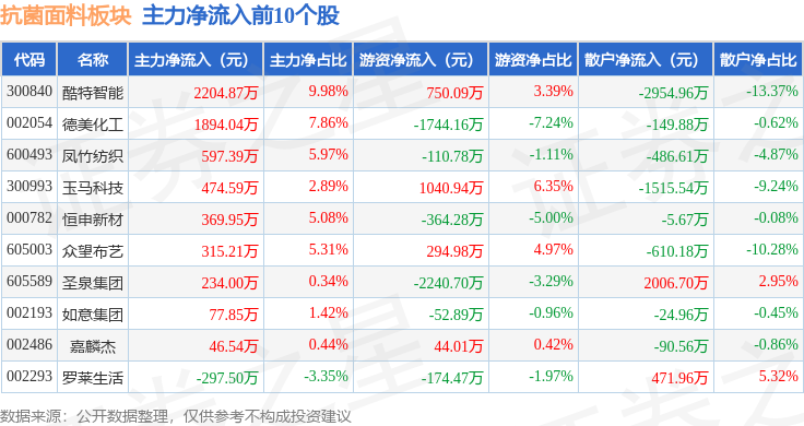 从资金流向上来看,当日抗菌面料板块主力资金净流出9481.8万元,游资资金净流出333.14万元,散户资金净流入9814.94万元。抗菌面料板块个股资金流向见下表: