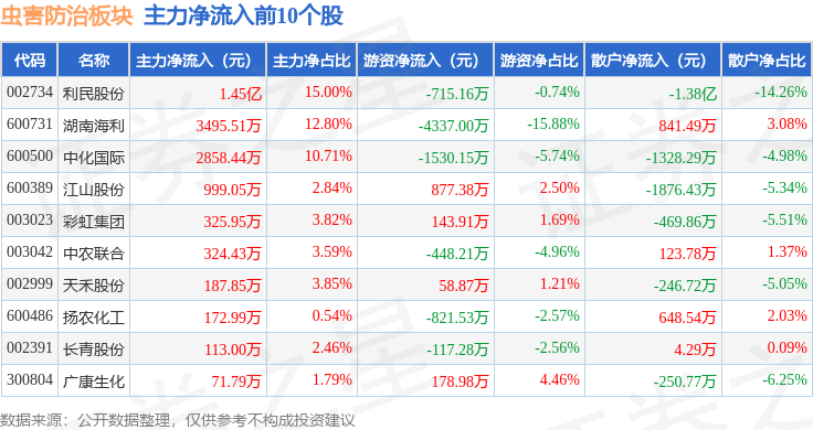 从资金流向上来看,当日虫害防治板块主力资金净流入1154.47万元,游资资金净流入990.13万元,散户资金净流出2144.6万元。虫害防治板块个股资金流向见下表: