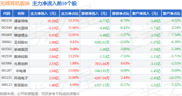 从资金流向上来看,当日无线耳机板块主力资金净流入20.56亿元,游资资金净流出23.8亿元,散户资金净流入3.24亿元。无线耳机板块个股资金流向见下表: