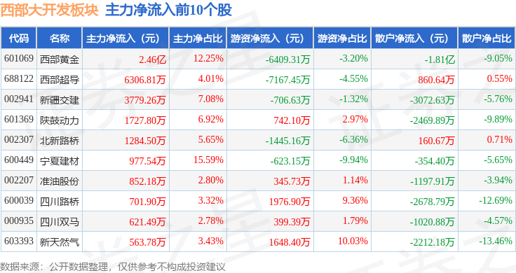 从资金流向上来看,当日西部大开发板块主力资金净流出13.27亿元,游资资金净流出7382.85万元,散户资金净流入14.01亿元。西部大开发板块个股资金流向见下表: