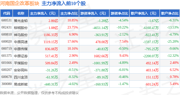 从资金流向上来看,当日河南国企改革板块主力资金净流入3498.31万元,游资资金净流出2.08亿元,散户资金净流入1.73亿元。河南国企改革板块个股资金流向见下表: