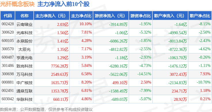 从资金流向上来看,当日光纤概念板块主力资金净流出4.14亿元,游资资金净流出4.09亿元,散户资金净流入8.23亿元。光纤概念板块个股资金流向见下表: