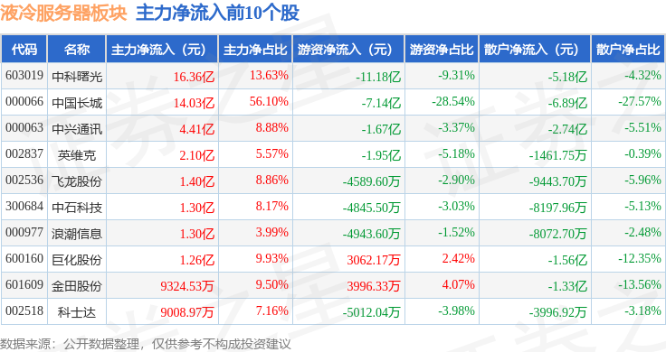 从资金流向上来看,当日液冷服务器板块主力资金净流入29.13亿元,游资资金净流出31.09亿元,散户资金净流入1.96亿元。液冷服务器板块个股资金流向见下表: