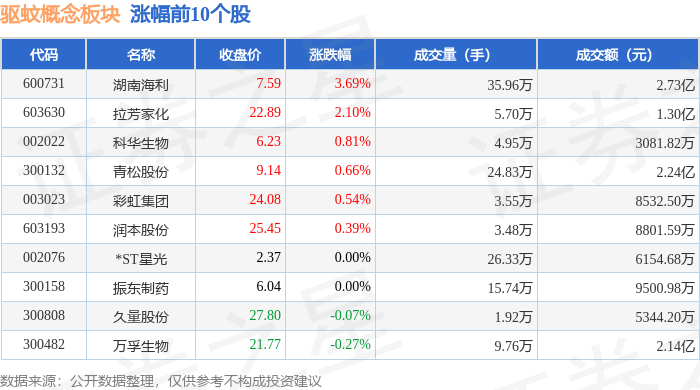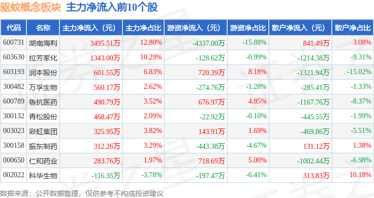 从资金流向上来看,当日驱蚊概念板块主力资金净流出1.82亿元,游资资金净流入6014.11万元,散户资金净流入1.22亿元。驱蚊概念板块个股资金流向见下表: